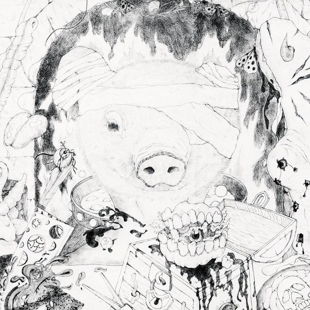 I once witnessed the slaughter of a pig. The animal's moans were full of horror, while the butcher appeared emotionless, and the diners laughed. This left me with a painful awareness of apathy. This painting is a reversal of that memory.